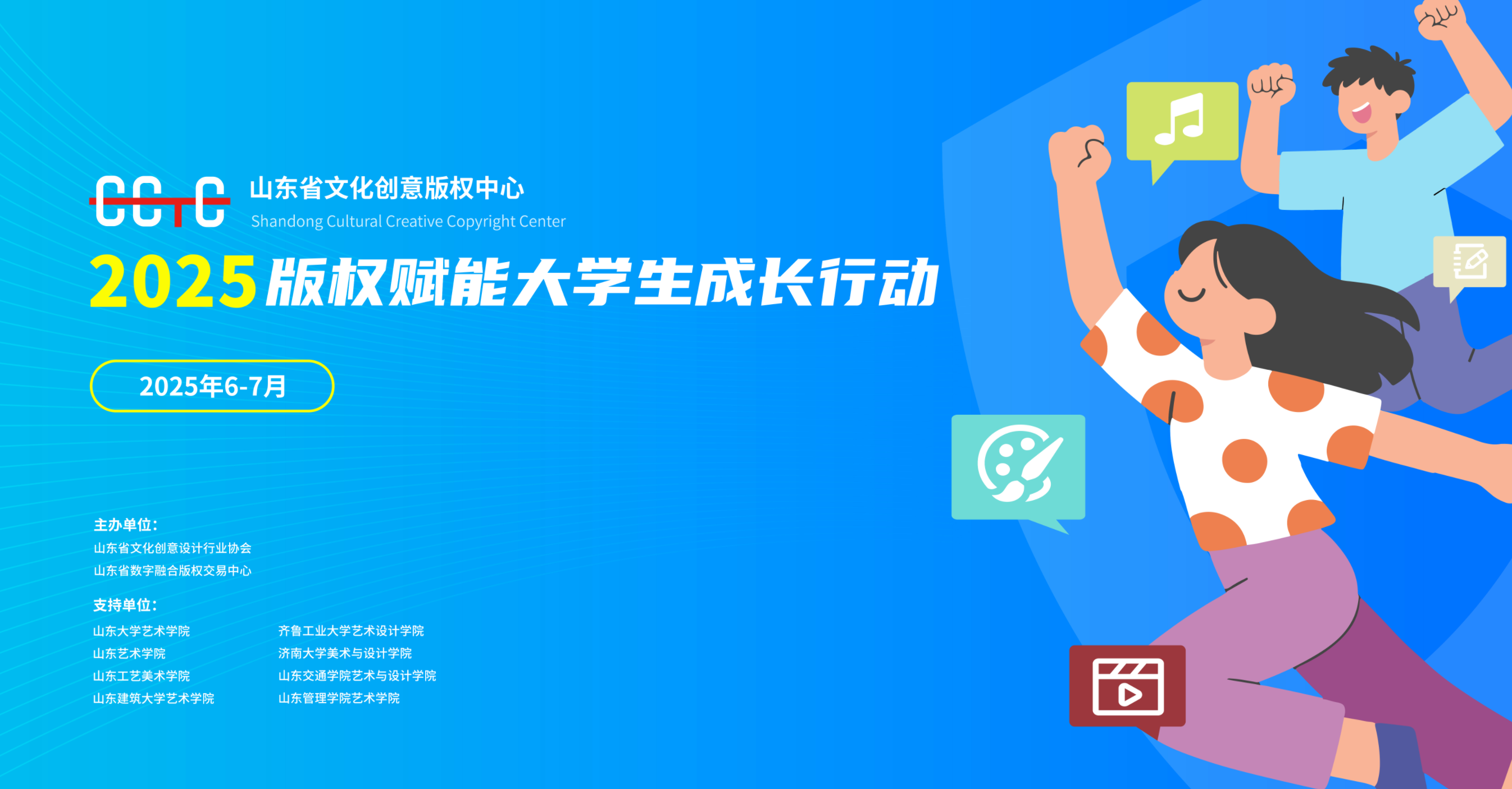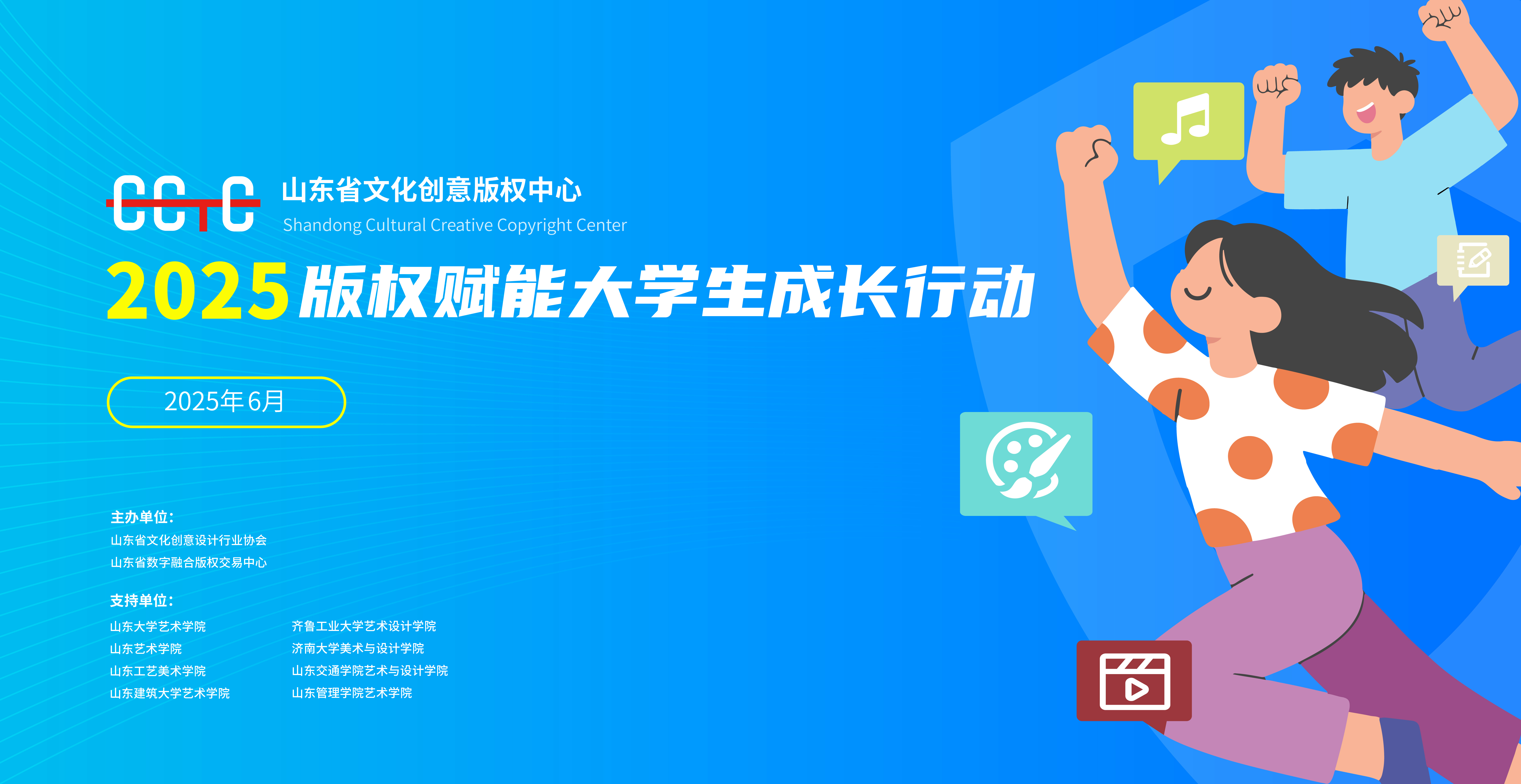 由山东省文化创意版权中心推出的“版权赋能大学生成长行动”即将开启进校园赋能行动!为你的原创作品保驾护航,助力其成为市场“硬通货”与商业“潜力股”!版权赋能 四重惊喜一、权威双证 官方版权登记证书+区块链确权存证。 双重法律保障,提升作品可信度与竞争力。二、宣传推广 优秀版权作品直通线上展示专区,获得平台重点流量扶持与曝光。 联动文化旅游、数字经济等领域重点项目,通过专题推介、跨界合作等形式,助力作品多元传播。三、产业合作 搭建高规格展示与授权平台,为原创者打通香港国际授权展、全球授权展·上海站(LEC)、中国授权展(CLE)等行业顶级展会的参展通道。 依托400+会员企业内推机制,联动上万家国内优秀企业资源,定向对接山东手造等制造类企业,同时拓展园区、基地等线下合作场景,实现从创意到产业的高效转化。四、定制化服务 版权登记、确权、维权、授权全流程指导。 大咖版权讲座(线下+线上),提供实操攻略。 生成个人成长档案(作品、荣誉、企业反馈),助力评优求职。为何选择我们?——省心、省力、超值!谁适合参与? 无论你是设计、动画、数字艺术、摄影、建筑,还是音乐、书法、美术、舞蹈......只要你有原创作品,这里就是你闪耀的舞台!限时福利 登录山东省文化创意版权中心官网(www.cctcsd.com) ▶▶立即登记作品 前1000名成功登记用户,免费享专家1对1咨询!(先到先得!) 版权赋能,让创意闪耀,让梦想变现!主办单位:山东省文化创意设计行业协会山东省数字融合版权交易中心支持单位:山东大学艺术学院、山东艺术学院、山东工艺美术学院、山东建筑大学艺术学院、齐鲁工业大学艺术设计学院、济南大学美术与设计学院、山东交通学院艺术与设计学院、山东管理学院艺术学院
