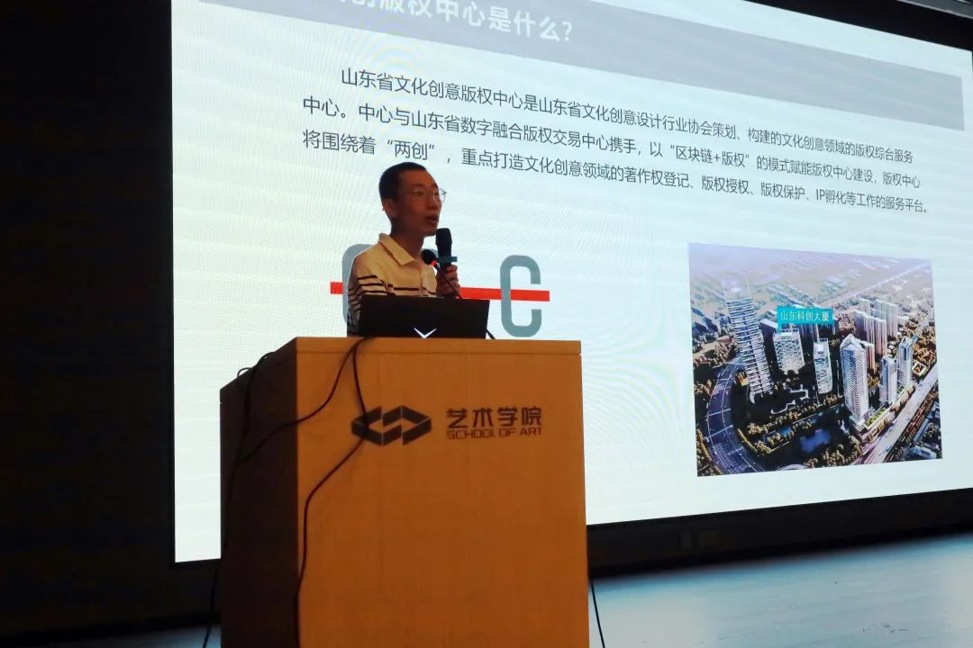 7月1日,为庆祝中国共产党成立104 周年,山东省文化创意设计行业协会联合山东建筑大学,共同举办“版权赋能大学生成长行动”进校园活动。此次活动作为双方精心策划的党建活动,旨在献礼党的生日,共话版权价值与商业化路径。山东省文化创意设计行业协会会长孙美华、山东建筑大学艺术学院院长陈淑飞、山东建筑大学艺术学院副院长王志远、山东建筑大学艺术学院学术副院长徐放、视觉传达设计系主任张晓波、工业设计系主任张蓓蓓、山东省文化创意设计行业协会副秘书长杜春、山东泉韵文化创意产业集团有限公司总经理裴双、山东省数字融合版权交易中心项目经理连少雄等嘉宾出席活动。